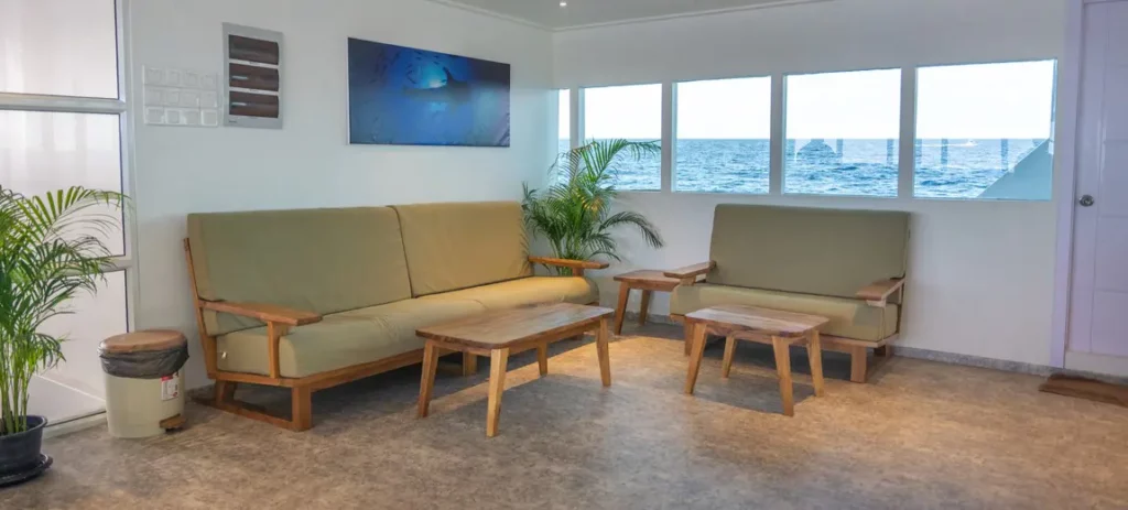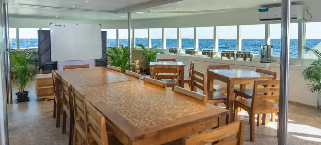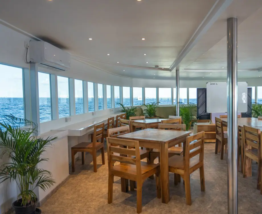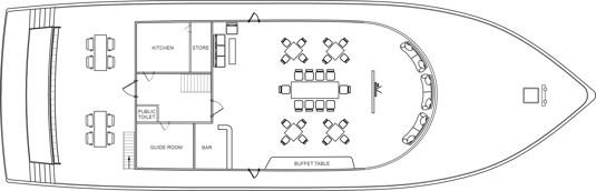 The dining room in the main deck is air-conditioned with a cozy bar offering a wide range of drinks including beer, wine and imported liquors. Our kitchen provides a variety of Asian, European, Maldivian, and Japanese cuisines. Three meals a day will be served including tea and coffee.