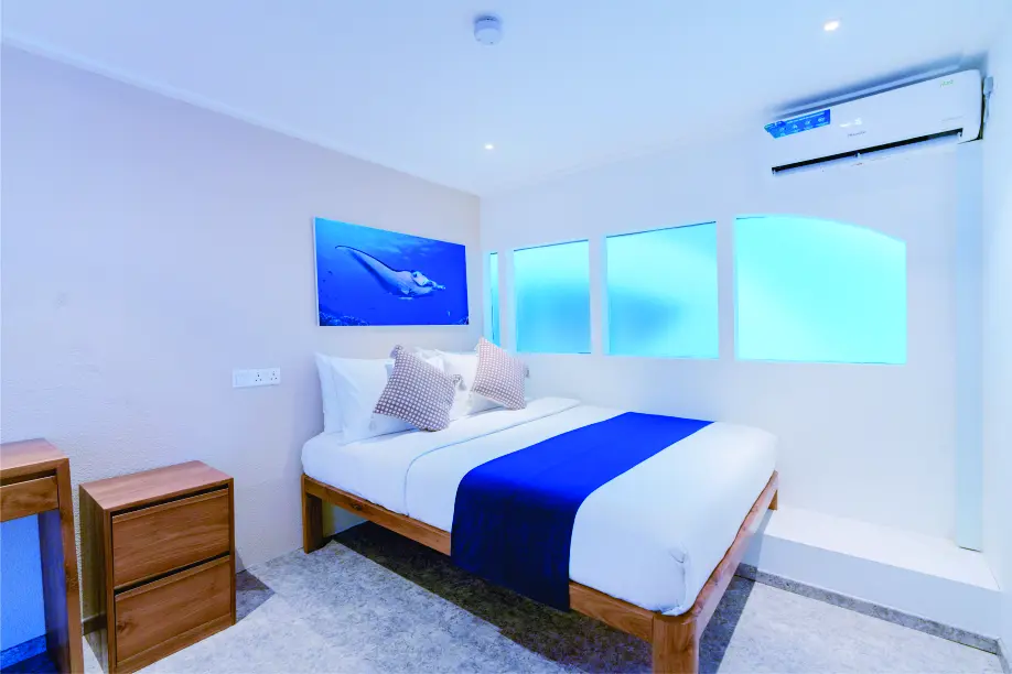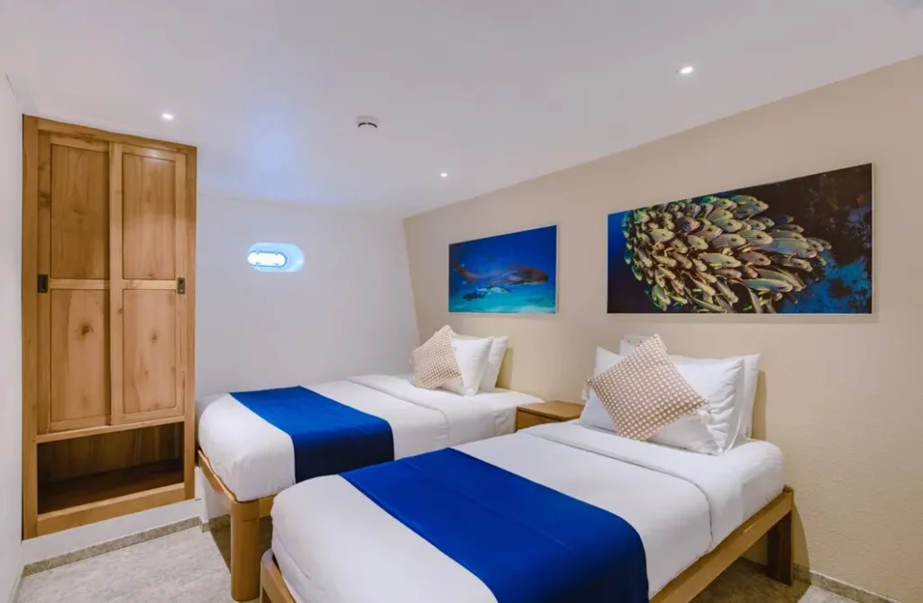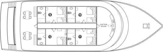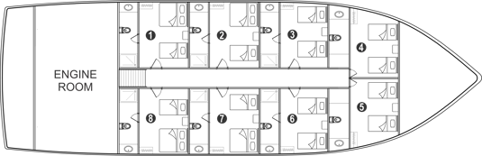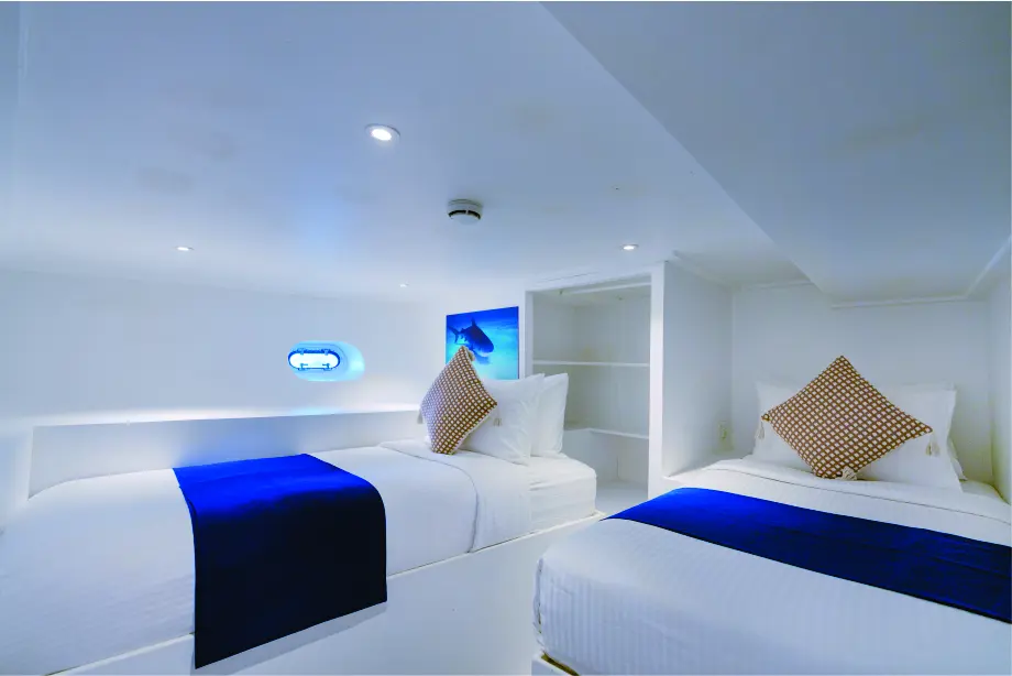 The Lower Deck offers cabins in two configurations, each airconditioned and featuring private bathrooms. These cabins provide a spacious and comfortable retreat, ideal for relaxing in privacy. A small window in each cabin allows natural light while maintaining a cozy, tranquil ambiance.